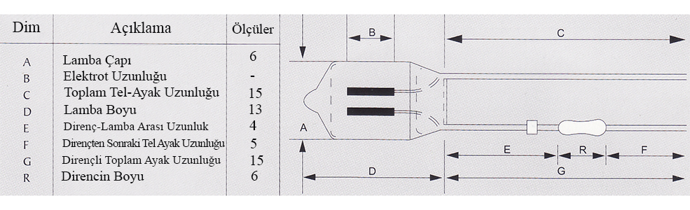 | NEON AMPUL | KOD NO | A | D | C-G | E | F | R | TEL CAPI | DİRENC | |